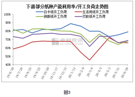 2020年3月歐美地區疫情發展初期,當地超市衛生紙一搶而空消息頻頻出現在各大媒體,需求激增,出現巴西增加歐洲發運量預期。但隨著中國公共衛生事件得到控制和歐美地區疫情的不斷蔓延,巴西紙漿出口重心繼續向中國傾斜。如圖2所示是2020年上半年和2019年全年巴西出口總額分地區占比圖,可以看到美國占比基本持平,中國占比上升2個百分點至45%,歐洲下降3個百分點至25%。歐洲需求降低主要原因是文化用紙市場低迷,據歐洲印刷紙制造商協會數據顯示,2020年前4個月歐洲文化用紙需求量698萬噸,較去年同期下降14%,生活用紙雖短期需求激增,但持續性不強。中國市場方面,如圖3所示,開工情況從二季度開始得到修復,紙漿消耗趨于穩定。綜合來看,歐美市場紙漿需求增長為“虛”,巴西紙漿供應重心向中國市場偏移為“實”。