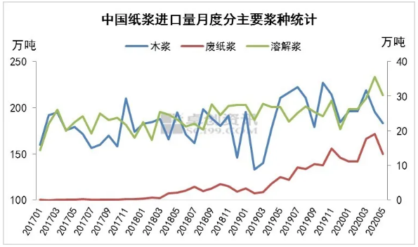 據(jù)海關(guān)數(shù)據(jù)顯示,2018年廢紙漿進口量29萬噸,同比增加2371%;2019年進口廢紙漿量91萬噸,同比增加209%;2020年前5個月進口量73萬噸,較2019年前5個月廢紙漿進口量同比增加280%,已經(jīng)占到2019年總進口量80%,前5個月廢紙漿的進口量占紙漿進口總量的6%,較去年同期占比增加4.09個百分點。預計2020年廢紙漿進口量持續(xù)增加,有望增加至200萬噸。