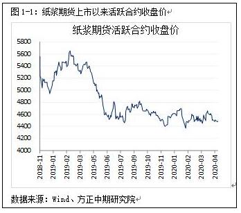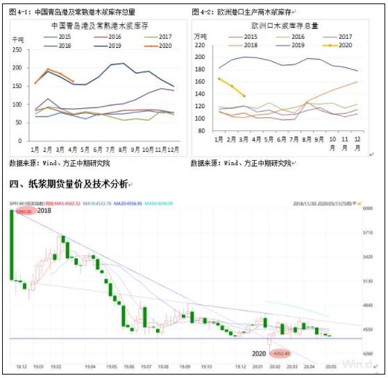 4月,海外疫情加速擴散,成品紙需求下滑,紙廠停機檢修增加,紙漿需求轉弱;國內復工提速,但文化紙及白卡紙庫存偏高,經銷商去庫為主,盈利收窄后紙廠對木漿維持按需采購,國內港口木漿庫存雖持續下降,但總量仍處高位。漿廠4-5月報價上漲,但需求疲軟下落地前景不明。市場預期較差及需求低迷下,紙漿價格繼續下探。