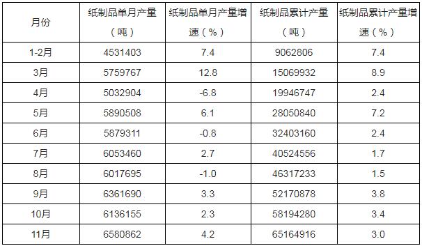 2019年1-11月中國紙制品產量及增速統計表